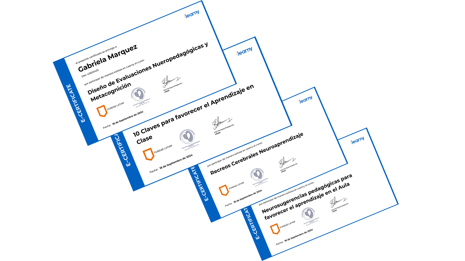 Al finalizar cada formación, obtienes un Diploma Digital avalado por la Asociación de Neuroaprendizaje Cognitivo, Buenos Aires, Argentina, que preside Rosana Fernández Coto, y FUNDAE LATAM, actual representante de Learny en Latinoamerica
